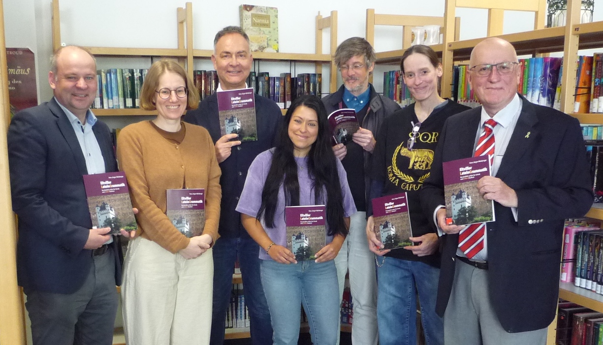 - Vorstellung der Eltviller LateinGrammatik in der Bibliothek des Gymnasiums Eltville; von links nach rechts: Schulleiter Jochen Kleinschmidt, die Lateinlehrkräfte Stefanie von Stramberg, Dr. Uwe Juras, Elena Lorenz, Dr. Christian Wollek, Marianne Kurucz, der Autor Dr. Hans Jürgen Molsberger.