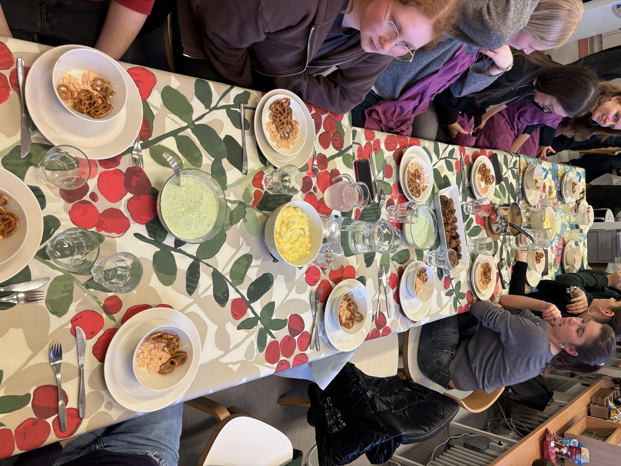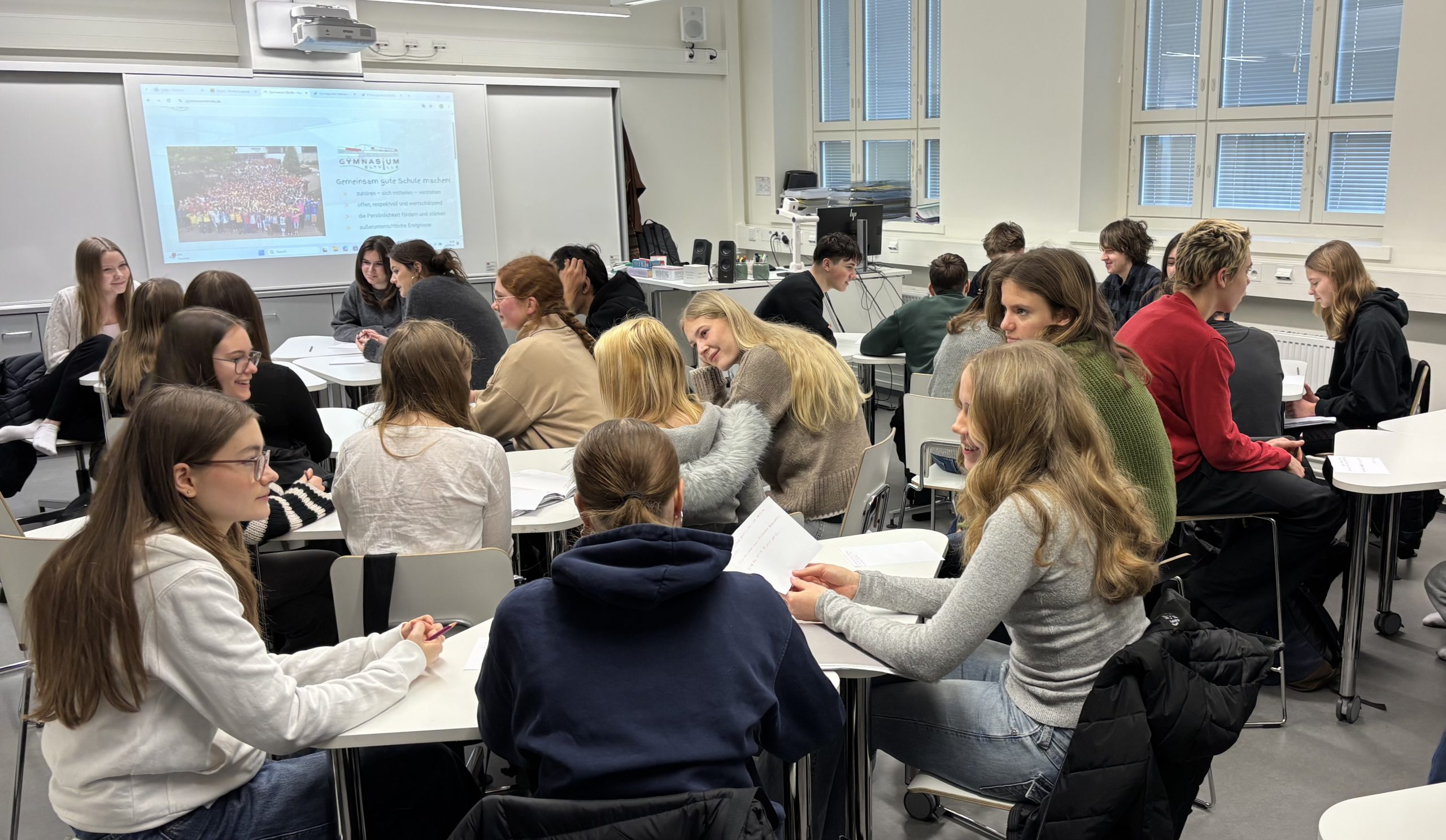 Am nächsten Tag begrüßte uns strahlender Sonnenschein und wir machten uns zu Fuß auf den Weg, um beim Tagesthema ‚Unser kulturelles Erbe’ unsere Erasmus-Austauschpartner kennenzulernen. Die Arbeitssprache war natürlich Englisch – kein Problem für uns! Der Direktor der Partnerschule, Jaakko Perttu erläuterte uns das Leitbild seiner Schule: „Togetherness, Wellbeing and Leaving No One Behind“. Wir stellten im Gegenzug auch unsere Schule, Deutschland und den Rheingau vor und tauschten uns anschließend in Kleingruppen über typische kulturelle Eigenheiten unserer jeweiligen Länder aus. Anschließend konnten wir einen zauberhaften Winterspaziergang an der Ostseeküste unternehmen und den glitzernden Schnee genießen. Danach gingen wir einkaufen, um in der Schulküche mit unseren finnischen Partnern zusammen traditionelle deutsche und finnische Gerichte zu kochen und gemeinsam an einer langen Tafel zu essen. Es gab neben finnischen Fleischbällchen mit Kartoffelbrei natürlich auch Spundekäs mit Brezelchen und Grüne Soße.